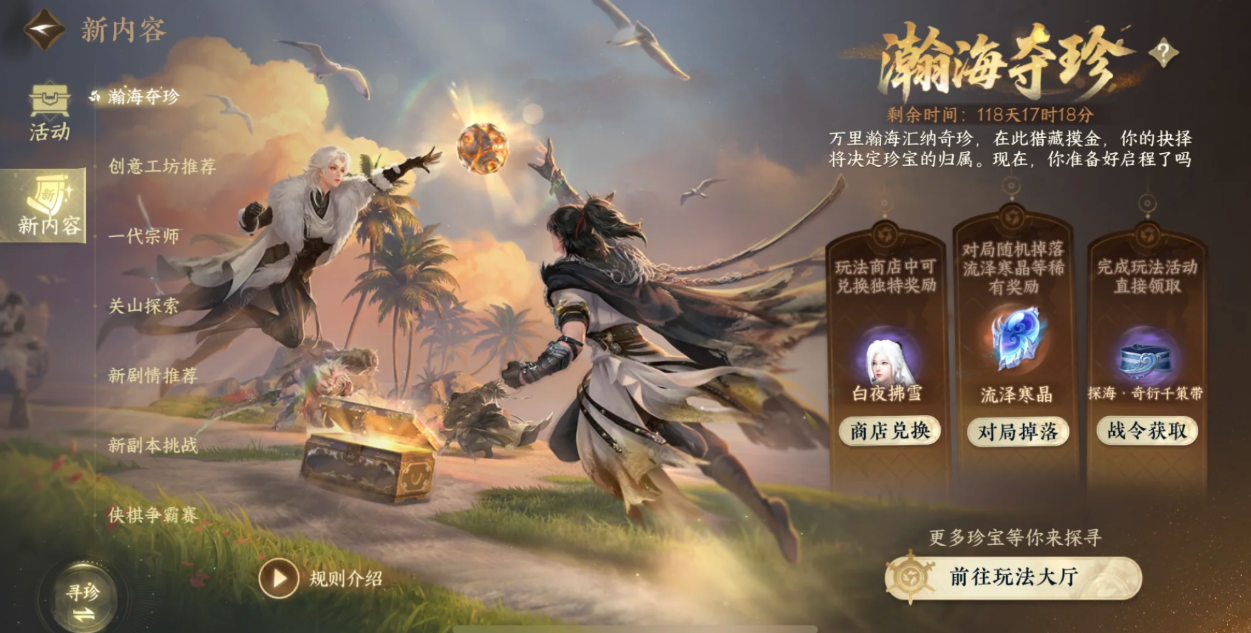逆水寒手游瀚海夺珍怎么玩“瀚海夺珍”是常规的摸金玩法,需要在刺桐港、苏吉丹岛的凡境/险境之中搜刮物资。通过开箱子、做任务拿到海量的材料、蓝紫金品道具,然后在撤离点成功撤走就行。夺珍可以选择单排或者双排,且初始的时候有系统赠送的凡品、精制和绝世套装券。用券能直接完成
